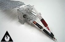 Com um sistema de engrenagens plásticas, à medida que a pena traseira balança, a engenhoca vai liberando o sangue de dentro da seringa sobre a ponta da caneta.